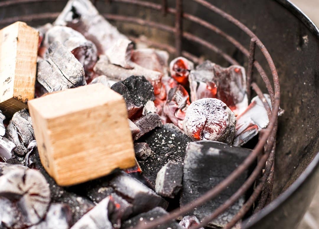 • וודאו שהאש שלכם מסודרת כהלכה, הדליקו 3-4 חופנים גדולים של גושי פחם, הניחו אותם באמצע מיכל הגחלים ואז מלאו את הסל בפחמים לא דולקים והוסיפו כמה שבבי עץ בשביל הטעם.