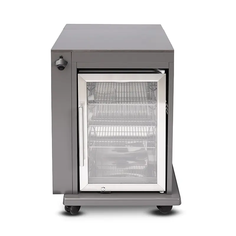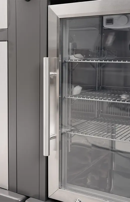 יחידת קירור איכותית למטבח החוץ שלך – הכוללת מקרר שקוף עם דלת זכוכית, תאורה פנימית ומדפים מתכווננים, נועדה לשמירה על משקאות ואוכל קריר ונגיש בזמן האירוח.
